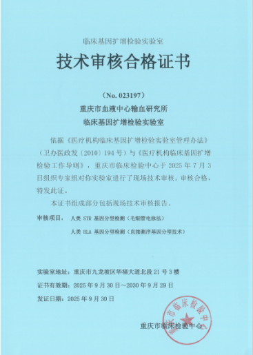 近日,重庆市血液中心输血研究所分子生物学实验室获得由重庆市临床检验中心颁发的“临床基因扩增检验实验室技术审核合格证书”。这不仅是对本实验室在临床基因检测领域 “技术硬实力” 与 “质量管理精细化水平” 的权威认可,更标志着重庆地区输血医学与移植相关基因检测服务迈入 “高标准、严规范” 发展新阶段,同时也为参加中华骨髓库新一轮HLA基因高分辨确认实验室遴选工作奠定坚实基础。